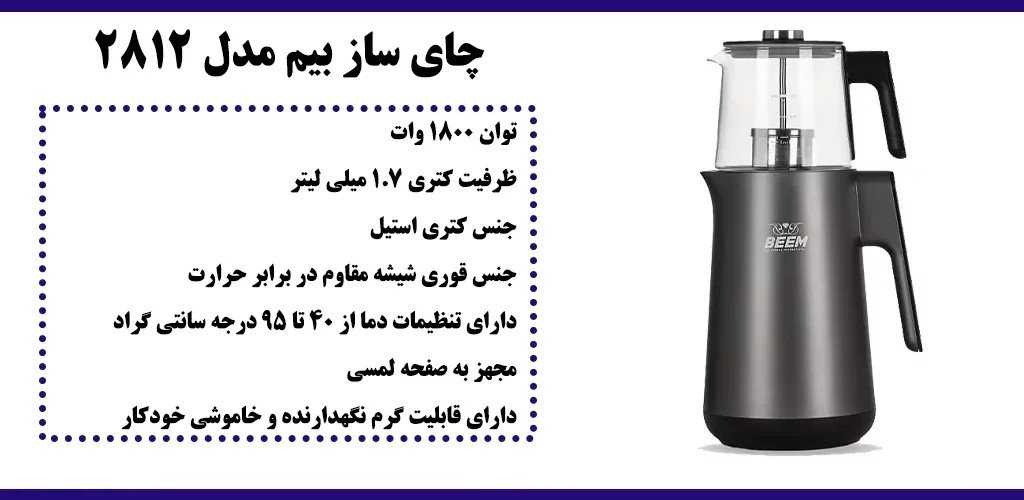 چای ساز بیم مدل 2812 نسبت به دیگر چای سازها متفاوت طراحی شده و جزو محصولات نسبتاً جدید بیم محسوب می شود. چای ساز برقی از بَدو ورود به بازار توانست فروش موفقی داشته باشد و نتیجه آن تولید چای ساز برقی توسط برندهای گوناگون گشت. چای سازهای جدید در دو نوع روی هم و کنار هم تولید می شوند که انتخاب هریک از آنها کاملاً به سلیقه شما بستگی دارد. داخل پایه چای ساز یک عدد المنت حرارتی وجود دارد که با کمک جریان برق داغ شده و سبب به جوش آمدن آب کتری می گردد. چای سازهای حرفه ای دارای تنظیمات دما هستند و می توان میزان دمای این المنت را از طریق آنها کنترل نمود. چای سازهای مختلف ویژگی های گوناگونی دارند، اما اکثر آنها به تنظیمات دما و زمان مجهز هستند. چای ساز بیم نیز شامل این موضوع می گردد و مدل 2812 یکی از جدیدترین کارهای این برند است.