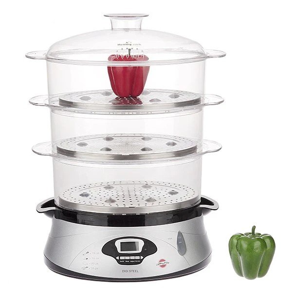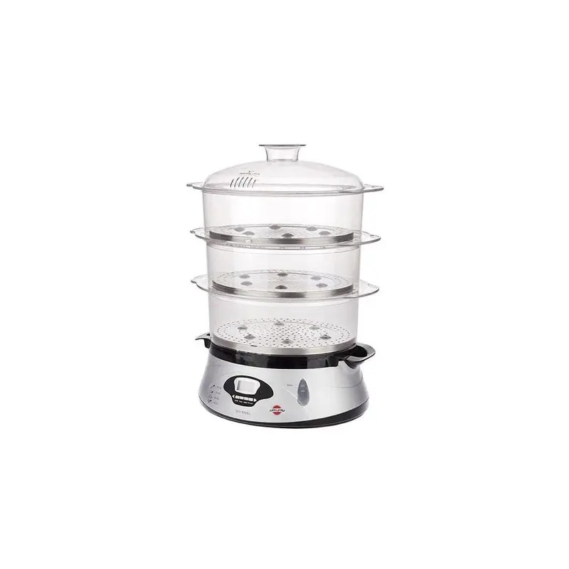بخارپز پارس خزر مدل دیجی استیل دستگاهی مناسب برای افرادی است که می خواهند غذای سالم و بدون روغن بخورند. این دستگاه برای تهیه مخلفات کنار غذاهای گوناگون هم کاربرد دارد. تهیه هویج پخته، سبزیجات مختلف، سیب زمینی پخته و ... با این محصول بسیار آسان است. توان بالای دستگاه آب را سریع به بخار تبدیل کرده و بخار داغ از میان طبقات و مواد غذایی مختلف عبور کرده و باعث پخت آنها می شود. وزن دستگاه کم است و ظرفیت بالایی دارد، همچنین در حین فعالیت و در میانه پخت هم می توان مقدار آب باقی مانده در دستگاه را از طریق نشانگر میزان آب کنترل کرد و در صورت نیاز به دستگاه آب اضافه کرد. پنل تنظیم دستگاه شامل دکمه ها و نمایشگر در جلوی آن قرار دارد تا از طریق آن تنظیم مربوط به مواد غذایی انتخاب و تعیین شود. طبقات را می توان روی هم قرار داد و از طرفیت کامل دستگاه بهره برد و در صورتی که مواد غذایی کم هستند می توان طبقات اضافی را از روی دستگاه برداشت . این مدل مجهز به 3 سینی از جنس استیل ضدزنگ نیز هست. بخارپز پارس خزر مدل دیجی استیل ﻣﺠﻬﺰ ﺑﻪ ﺳﻴﺴﺘﻢ ﺍﻳﻤﻨﻲ ﻗﻄﻊ ﺍﺗﻮﻣﺎﺗﻴﻚ ﺩﺭ ﺻﻮﺭﺕ ﺍﺗﻤﺎﻡ ﺁﺏ ﻣﺨﺰﻥ است تا به این ترتیب دستگاه ایمن بوده و خطری ایجاد نشود. پارس خزر تولید و عرضه کننده لوازم خانگی برقی است که به خوبی شناخته شده است و گزینه ای مناسب پیش روی خریداران محسوب می شود.